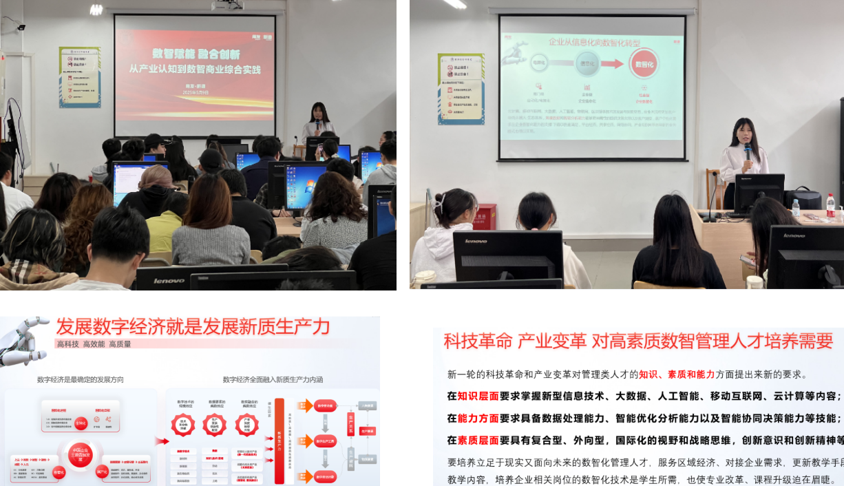 5月10日,用友集团新道科技服务总监张书香受邀为我校tyc234cc 太阳成集团学生开展生产认识实习-跨专业实训企业导师讲座。讲座以“数智赋能 融合创新——从产业认知到数智商业综合实践”为主题。在讲解中,她凭借自身在数智商业领域的专业见解,通过丰富的案例与实操演示,为同学们详细阐述数字经济时代产业变革的趋势,分享企业数智化转型中的实践经验与成果,鼓励同学们立足自身专业积极拥抱和掌握跨专业新技能,为未来投身相关领域筑牢根基。