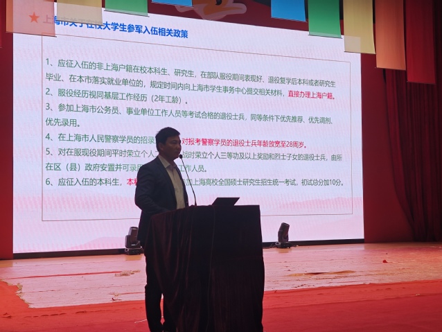 毕业班辅导员阿布都如苏力·麦麦提明从个人成长锻炼、教育教学、考研升学、考公考编、经济待遇和就业落户等多个方面介绍2025年在校大学生参军入伍的相关优待政策,切实保证大家能够应征动心、服役安心、退伍放心,为国防建设奉献青春力量。