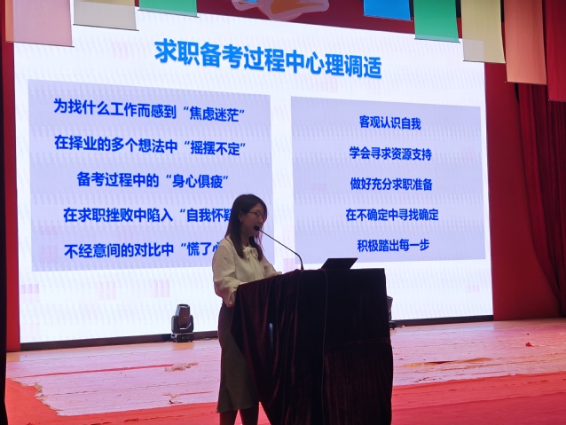 孟延新从求职备考过程心理调适的角度为同学们分析了现在的就业现状,在面临求职备考压力期时应该如何做好自我调节。强调同学们在选择毕业去向时要拒绝盲从、切勿观望,认清形势,早立目标,制定求职方案。同时,在求职过程中要精写精改精准投递简历,积极关注校内外招聘信息,在面试过程中要关注求职礼仪,鼓励同学们要转变就业观念实现人生梦想。多练手,多积累,机会为有备人而来。最后,为同学们“输出干货”,提出在就业过程中要切实保护自身权益,关注好自身的未来发展。