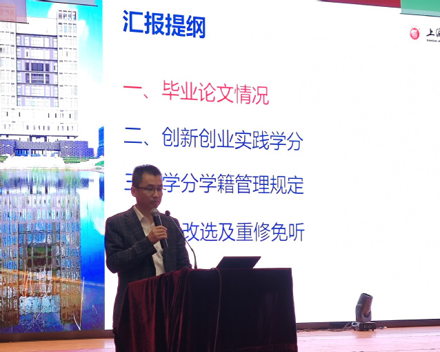 胡伟首先向全体毕业生介绍了毕业班教学工作相关事宜,嘱咐同学们结合培养计划查询学籍审核,关注毕业论文时间节点和创新创业课程学分完成情况,确保能够顺利毕业。